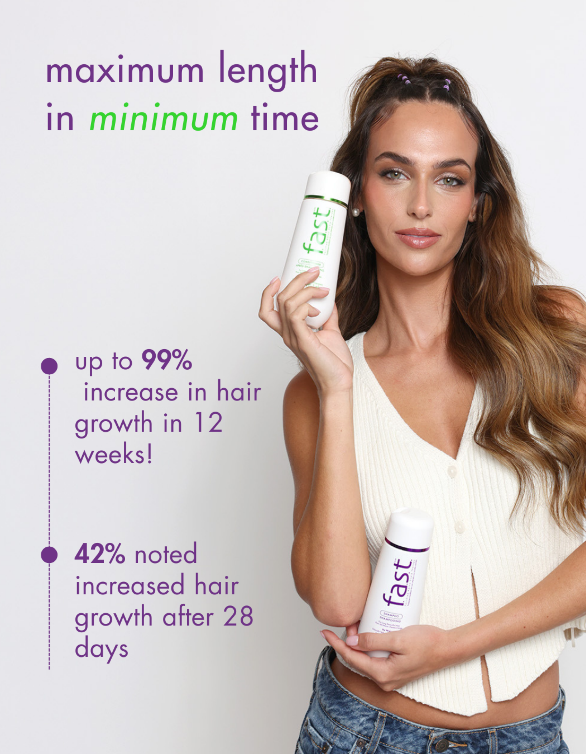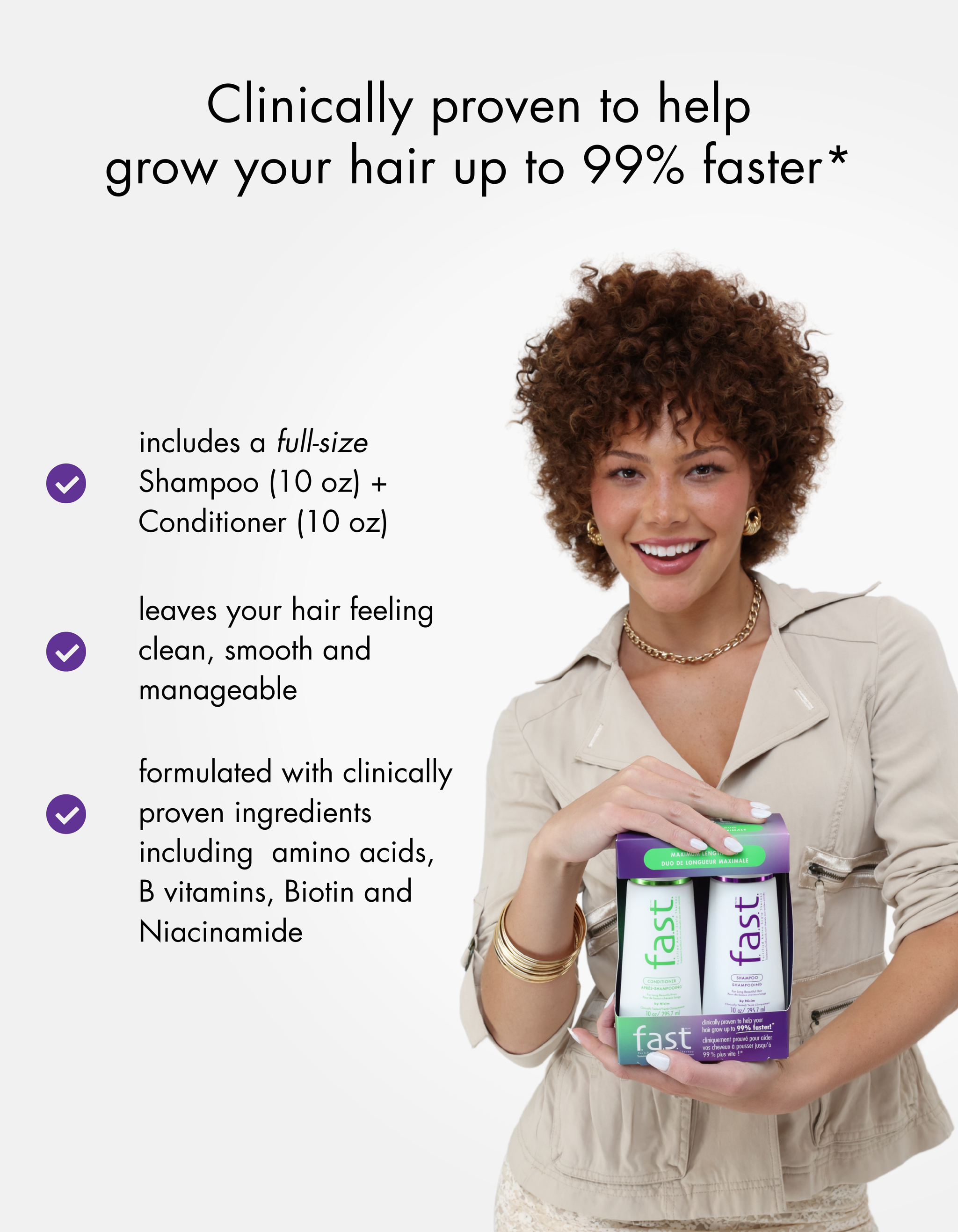 F.A.S.T. Shampoo and Conditioner leaves your hair feeling full and bouncy while helping accelerate your hair grow! Our special blend of clinically proven ingredients, combined with our unique extraction and blending methods, allows for optimal penetration of our proprietary blend of amino acids, B vitamins, Biotin and Niacinamide for maximum length in minimum time. Clinically proven to help grow your hair up to 99% faster